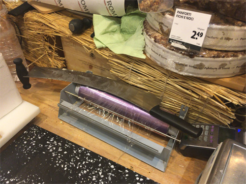 | ↑オランダ特産の円盤型のチーズ「ゴーダ」を切り分ける、大きなナイフ。ゴーダの表面はワックスでコーティングされている上、熟成の進んだものほど硬いので、おうちの包丁で切るのは本当に難儀する。ゴーダのおいしさにホレた今、こんなナイフが欲しくなった。 |