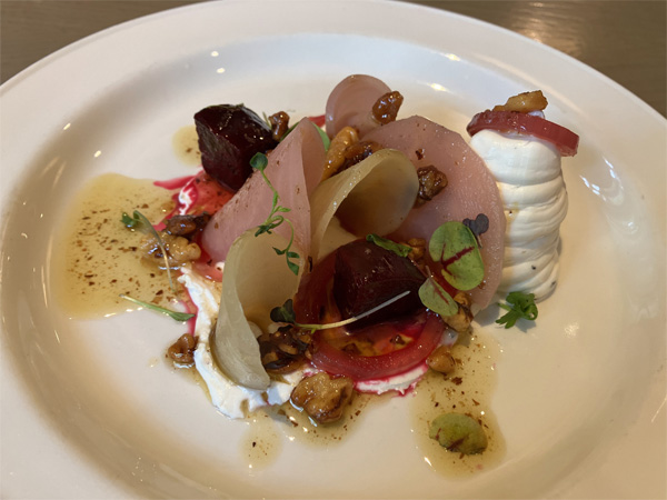 | ↑ヤギ乳チーズのムースと、薄切りラディッシュの甘酢漬け。 |
