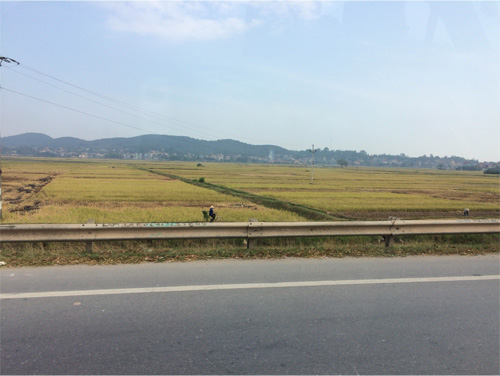 ハノイを出て間もなく、よく整備された広い舗装道路に入ったが、30分足らずで片側1車線の狭い道に変わった。舗装はされているが道の両側はむき出しの地面だし、工事であちこち掘り返しているしで、とにかく土ぼこりがひどい。沿道の樹木はいかにも南国らしい大きな葉っぱを広げているが、どれも泥をかぶって真っ白だ。雨が降った直後しか光を受けられないだろう。