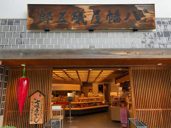 | ↑大きなとうがらしが善光寺表参道のお店の軒先に。江戸時代から280年以上続く七味唐辛子の老舗、八幡屋礒五郎(やわたやいそごろう)本店。人気商品「七味唐からし」は我が家の調味料の常連さんでもある。 |