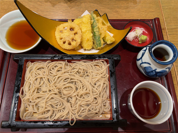 | ↑夏野菜天麩羅せいろ。おそばは並盛りでもたっぷり。 |