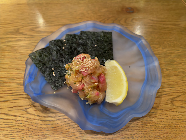 | ↑おとうさんが注文した一品料理、信州大王イワナのなめろう。くせのないあっさりめの白身で、ホントに川魚!?とびっくり。信州大王イワナは長野県水産試験場が開発した養殖品種だそうだ。 |