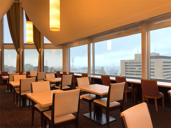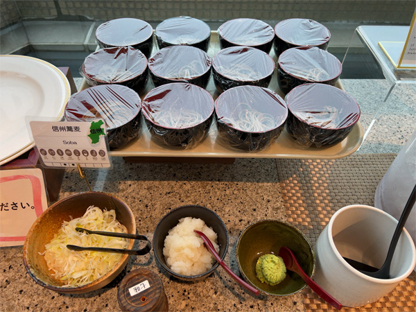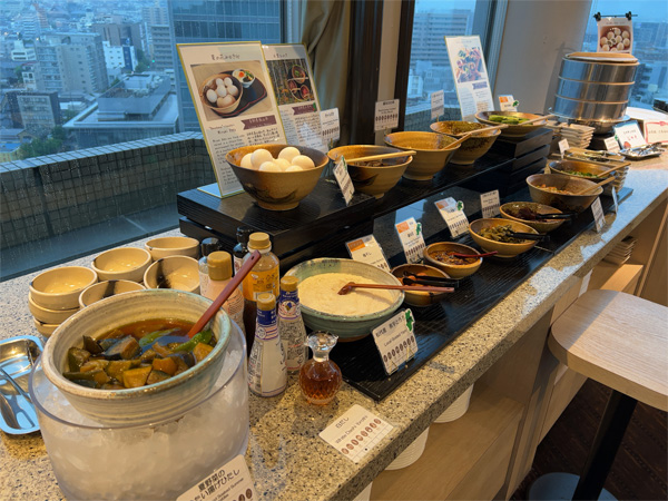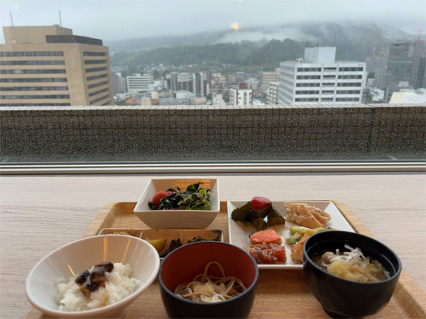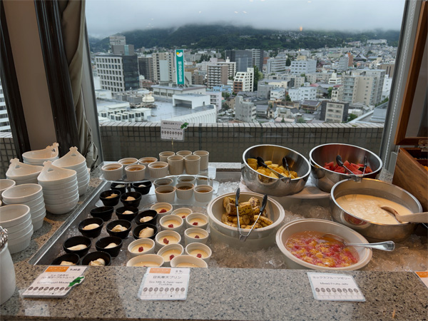 ホテル最上階の16階、広い窓辺で長野の街を眺めながら一日が始まった。信州の郷土料理や地元の農産物を使った料理が豊富で、添えられた説明書を読むだけでも楽しい。