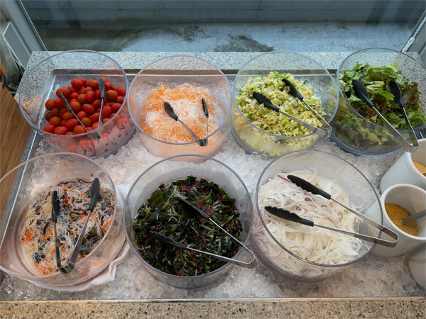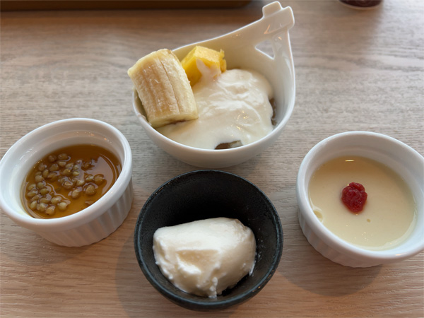 | ↑マイ・チョイスのデザ〜ト。左から時計回りに韃靼そば茶プリン、フルーツ+ヨーグルト、豆乳寒天プリン、シェフ手作り八ヶ岳ヨーグルトムース。 |