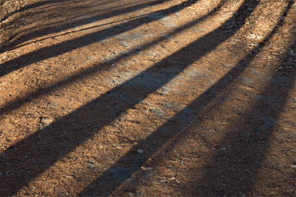 | ↑カラマツの落ち葉の道に、朝日が木々の影を作る。 |