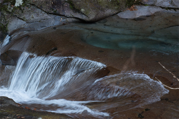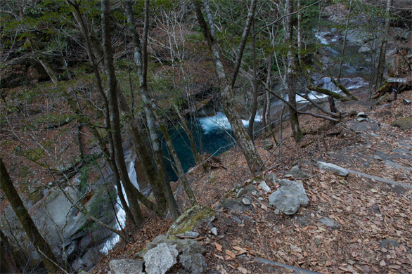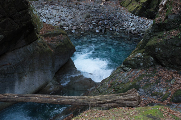 | ↑三重の滝の末。西沢をよく知る人によると、季節によって、また、日によっても水の色が違うそうだ。なるほど、確かに違う。 |