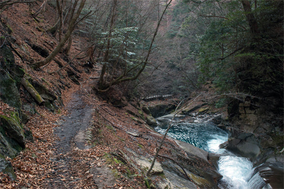 | ↑1段目の滝付近から後ろを振り返って。画面の真ん中あたりに滝見台が小さく写っている。 |