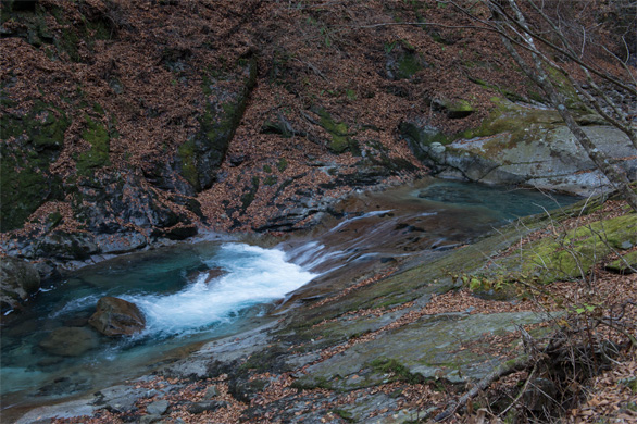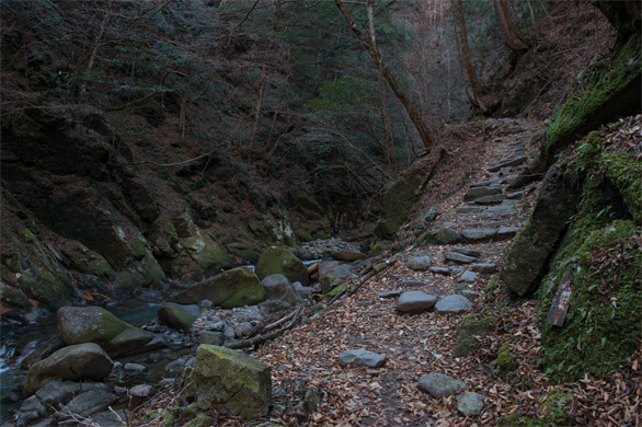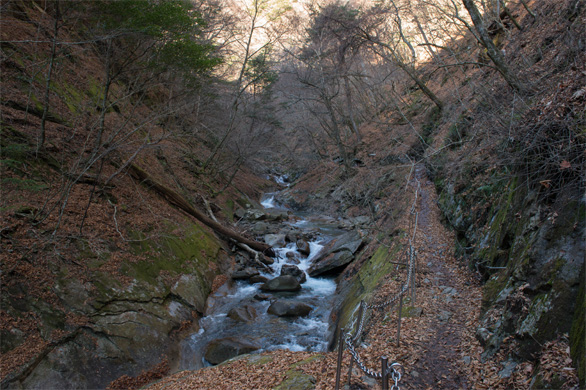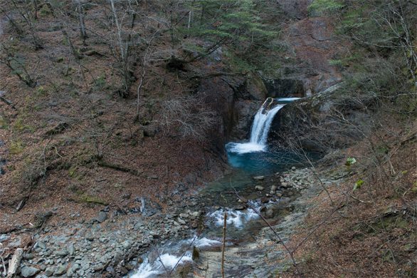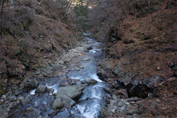 | ↑方杖橋から写す。向こうに七ツ釜五段の滝(ななつがま・ごだんのたき)の滝壺が見える。数日前に雪が積もったそうだが、すぐに気温の高い日が続いて雪が溶けたからだろう、水量がずいぶん多い。地元の人の話では、下流の塩山市(えんざんし)でも用水路の水かさが増していたそうだ。 |