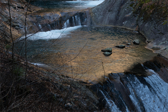 | ↑時刻はそろそろ10時半。深い谷にようやく日の光が届き始めた。滝壺の一つが金色に輝く。 |