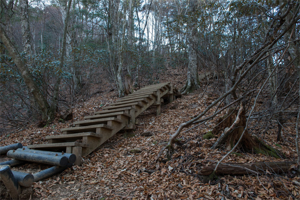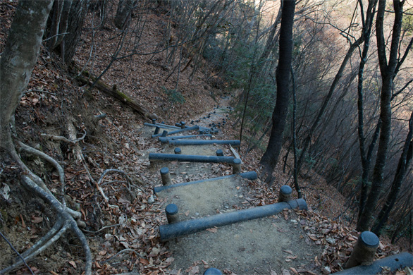 | ↑山道の終点まであと数段。登ってきた道を見下ろして。ふぅ。 |
