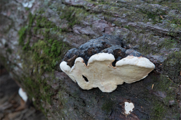 | ↑倒れた幹に生えた大きなサルノコシカケ(猿の腰掛け)を写しながら、ひと休み。 |