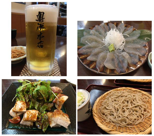 甲府駅南口、奥藤本店(おくとうほんてん)甲府駅前店にて。右上は刺身こんにゃく、左下は富士桜ポークの網焼き。山梨の食材が楽しめるお蕎麦屋さんだ。