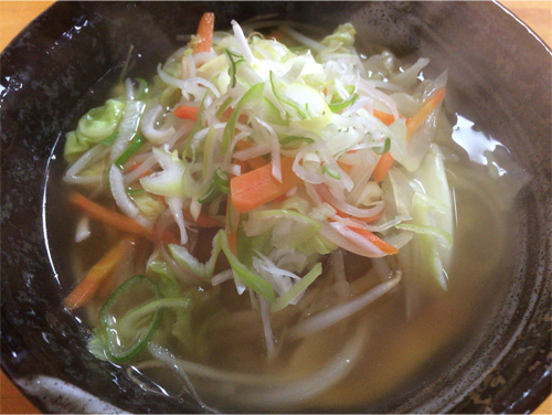 | ↑野菜そば。沖縄すばに野菜がたっぷり乗っている。那覇の県庁舎B1「南天」にて。おいしい&安いと評判で、県庁HPに「一般の方もどうぞ」とあったので、遠慮なく寄らせていただいた。 |