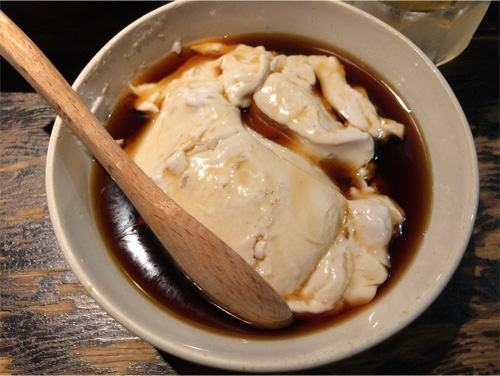| ↑落花生の絞り汁にデンプンを混ぜて固めたジーマーミ豆腐。胡麻豆腐のようなもっちりした食感だが、こちらのお店のジーマーミ豆腐はふるふると柔らかく、甘辛いタレとよく合う。 |