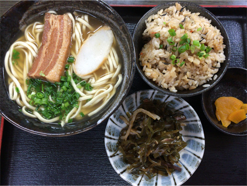 | ↑沖縄すば、沖縄の炊き込みご飯「ジューシー」、切り昆布の煮物。初日のおとうさんの夕ご飯。 |