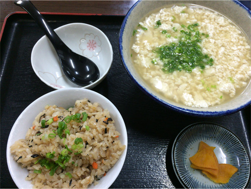 | ↑ゆし豆腐定食。ゆし豆腐とは、型に入れて固める前のそぼろ状の豆腐。2日目の私の夕ご飯。 |