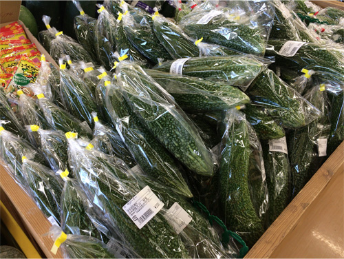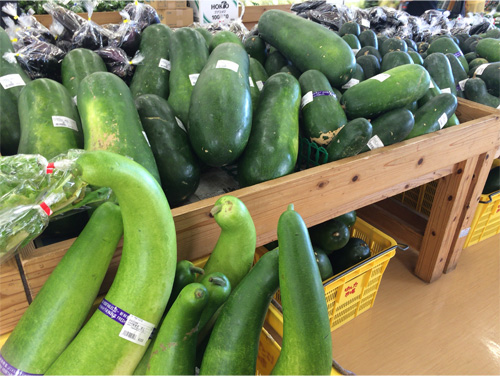 | ↑手前の長い瓜はユウガオ、棚に乗っているのは冬瓜。どちらもこの大きさで300円前後。 |
