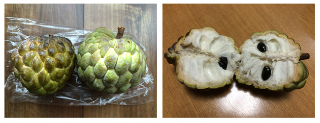 | ↑シャカトウ(釈迦頭)。バンレイシとも。大きさはこぶしくらい。2個400円。買って4日後にようやく柔らかくなった。縦に割ったのが右の写真で、白い果肉を食べる。真っ黒いものは種。酸味はほとんどなく、甘い。 |