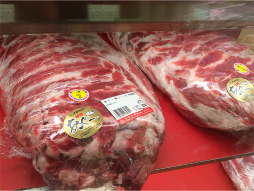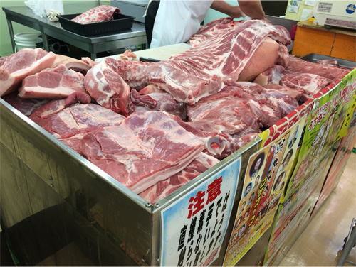 | ↑豚肉の切り分け中。沖縄は豚肉のおいしいことでも知られている。 |
