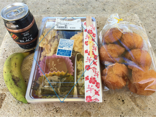 | ↑はごろも市場で仕入れたお昼ご飯。デザートはまんまるの沖縄ドーナツ「サーターアンダギー」と島バナナ。バナナは8本組のうちの1本で、食い意地張ってあわてて食べたら完熟にはほど遠く、激渋かった。食べごろになったのは、シャカトウと同じく4日後だった。 |