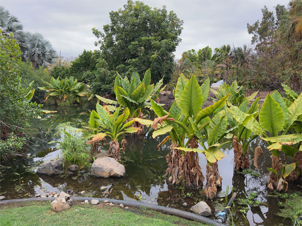 | ↑ヤシ以外の植物もたくさん展示されている。この木の解説板には「パンの木の祖先」とある。 |