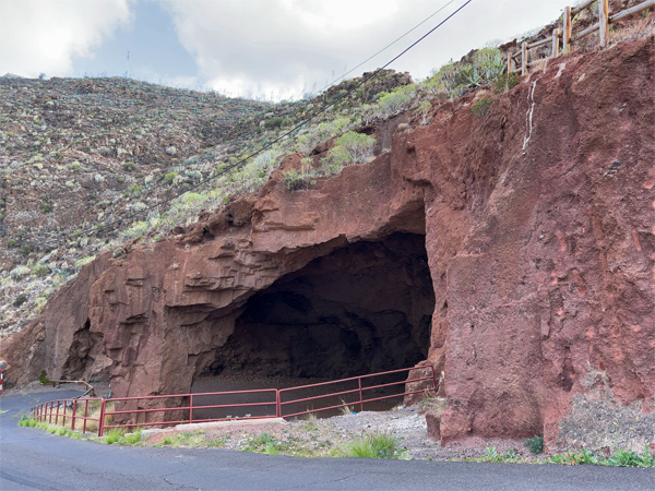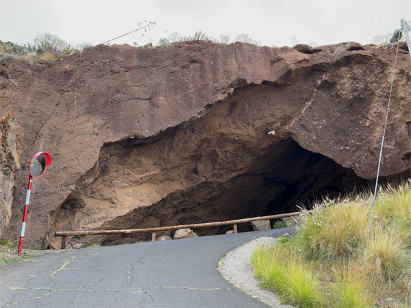 住宅街から車道に出て見上げると、赤っぽい色をした崖と大きな穴が見えた。目的地のクエバ・ロハだった。なるほど、赤い(Roja)洞窟(Cueva)だ。