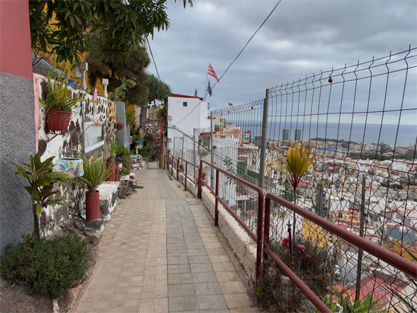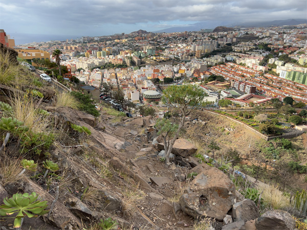 登り坂が一段落すると、案内板にある通りの素晴らしい眺めが広がった。サンタ・クルスの街と大西洋が一望できる。よく晴れた日にはグラン・カナリア島も見えるそうだ。