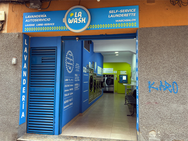 ![]() 御洗濯処「ラ・ウォッシュ」 私にとって今回の旅行の最大のミッションは、お洗濯。近所にコインランドリーがないか探したところ、歩いて数分の所に1軒見つかった。スペイン中に店舗のある、「ラ・ウォッシュ」というコインランドリーだ。 洗濯物の詰まった大きな袋を肩から下げ、小洒落たカフェやブランドショップで華やぐセントロ地区を背に坂道を上ると、路地の左右は地元の人の生活圏に変わっていった。果物や野菜がのぞくよろず屋を過ぎると、ラ・ウォッシュの空色の入り口が見えてきた。