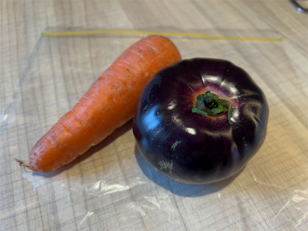 | ↑野菜欠乏、もう限界。にんじんとなすび色のトマトを仕入れて丸かじりした。にんじんは甘くて柔らかく、そのままで十分おいしい。トマトはおもしろい色をしているが、果肉はフツーのトマトの色、味もフツーのトマトの味だ。スーパーでもバラの青果はキロいくらの量り売りなので、必要な分だけ買える。 |