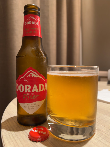 | ↑ご当地サンタ・クルスの醸造所「ドラダ」のピルスナー。ドラダはカナリア諸島で一番おいしいビールとの評判で、楽しみにしていた。250mlびん1本あたり0.6ユーロ前後(100円)はかなりうれしい。6本パック、何回買ったっけ(こら)。 |
