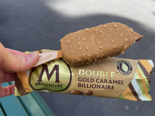 | ↑マグナムの棒アイスクリーム。ヨーロッパに来たら、最低1本は食することにしている。棒に当たり印がないかな・・・ないとわかっていてもひっくり返したりして探しちゃう、この哀しいサガ。 |