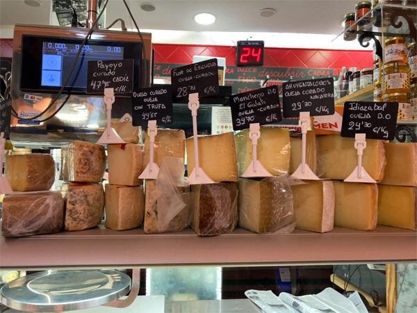 | ↑ベベス。ショーケースの上にスペイン産のチーズがたくさん並ぶ。好きな大きさで切り売りしてくれる。 |