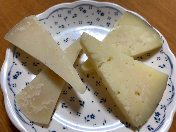 | ↑左2枚はテネリフェ産、右はマンチェゴチーズ。テネリフェ産は香りとコクが深い。マンチェゴチーズはしっとり滑らか。 |