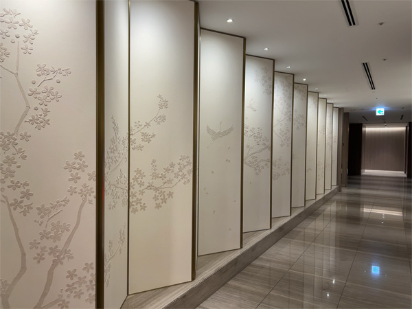 | ↑廊下の屏風。JALのシンボル、鶴が舞う。 |