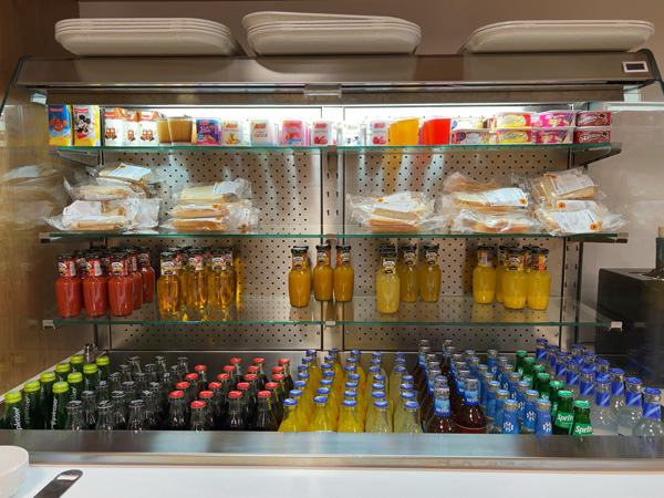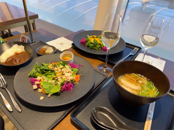 | ↑空港ラウンジに普通にあるはずものがここにはなくて、戸惑った。カウンターの上にごちそうがまったくないのだ。それもそのはず、テーブルのQRコードをスマートフォンで読み込み、表示されたメニューからオーダーする方式だった。 |