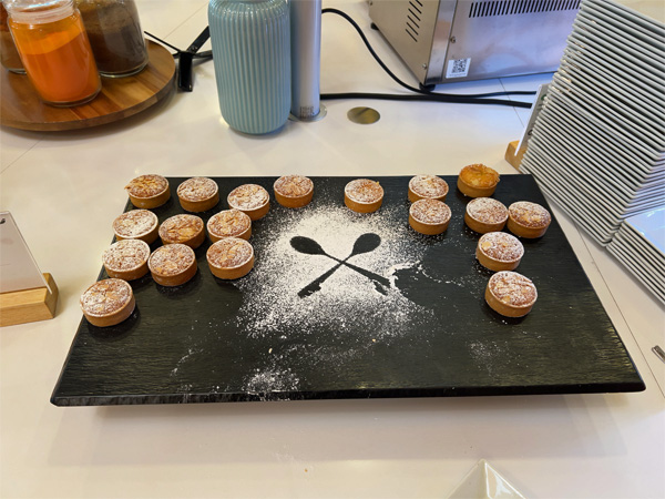 | ↑スペインの伝統的なアーモンドケーキ「タルタ・デ・サンティアゴ」、ひと口サイズ。真ん中にスプーンの粉砂糖の型抜きがある。もう1ついただこうと思って行ったら、残り3コになっていた。大人気のようだ。 |
