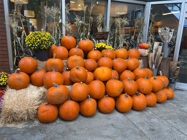 | ↑スーパーの軒先に、ハロウィンのランタン用のカボチャが積まれていた。1個9.99ドルだって(1,518円)。 |