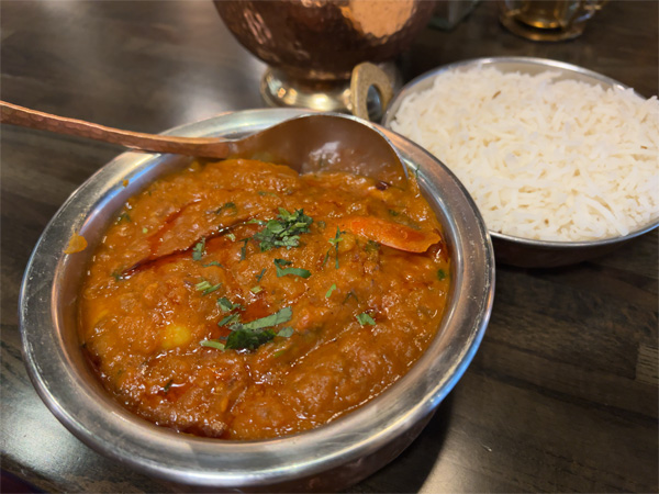 | ↑シェフおススメ、えびカレー。辛さは「マイルド」。4段階から選べる。旨味たっぷりの大きなえびがいっぱい入っているよ。 |