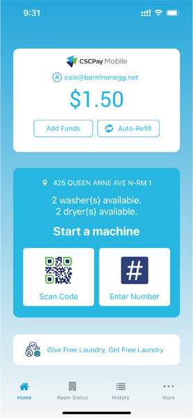 少しでも荷物を減らしたい私たちにとって、洗濯室の存在は本当にありがたい。メディテレニアン・インでは標準コースの洗濯、乾燥はどちらも1回1.75ドルで(266円)、利用にはCSCPay Mobileというスマートフォン用のアプリが必要だった(次の画像。アプリのメイン画面)。「コインランドリー」という言葉は日本でもおなじみだけれど、このアプリ、キャッチフレーズの通り「コインレス・ランドリー」(小銭不要のお洗濯)だ。洗濯機や乾燥機に付いているQRコードをアプリで読み取り、残高から料金を支払って機器のスタートボタンを押すと、洗濯や乾燥が始まる。アプリを開けば残り時間が正確に表示されるので、洗濯が終わる頃を見計らって洗濯室へ行ってみたらまだガラガラ動いていた、なんて事もなく、便利だった。