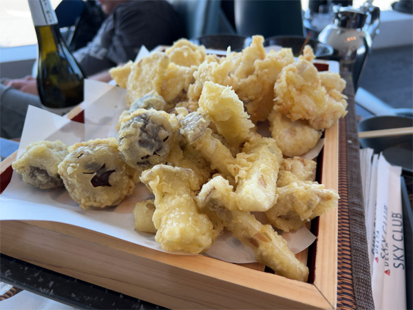 | ↑揚げたての天ぷらと日本酒「獺祭」。スタッフの方がワゴンに乗せて客席を回り、好みの天ぷらを取り分けてくれた。 |