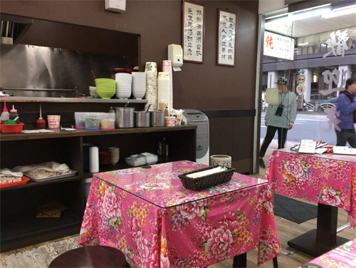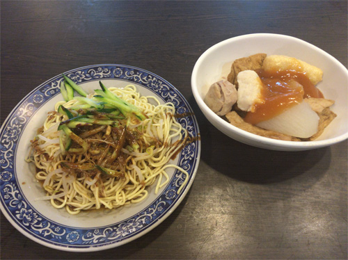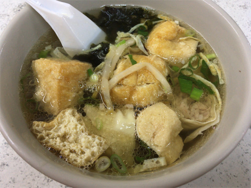 買い物客らしき若い女性が数人、この食堂に連れ立って入っていったので、私もあとに続いた。壁のメニューの「油豆腐細粉」を見て、「豆腐」なんだから、きっと、あの豆腐の仲間に違いない、お昼ご飯はコレと決めたのはいいけれど、中国語で何と発音するのかハタと困った。奥さんに「ゆとうふ・さいふん」と音読みでお願いしてみたら、奥さんはちょっと考えてから「はいはい、ユドーフ○○ね」。○○の部分は聞き取れなかったけれど、どうにか通じたようだ。 「油豆腐」は厚さ3cm以上ある油揚げだった。スープをたっぷり吸い込んでいる。油揚げ、肉団子の湯葉巻き(だと思う)、ワカメなどの具の下に、ぷにぷにの春雨が隠れていた。春雨のことを中国語で「細粉」というのだろうか。帰国後に調べたが、どうもはっきりしない。