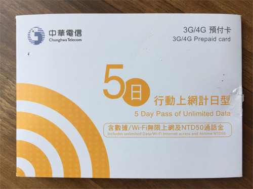 海外用携帯電話などを扱うテレコムスクエア社が、台湾の大手通信会社「中華電信」のプリペイドSIMカードを販売している。テクノロヂィとの親和性が高いとは言えないおかあさんが、言葉も通じない初めての場所でまごつくのはぜひとも避けたいので、行き、成田空港第2ターミナルの同社のカウンターでSIMカードを買って行った。台湾で買うより値段は高めだが、それでも他の地域用のSIMカードに比べるとずいぶん安いし、何より、期間内はデータ通信量無制限なのが魅力的だった。