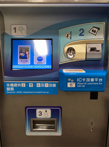 | | ↑片道切符専用の「單程票售票機」。タッチスクリーンで行き先と枚数を選ぶ。日本語、英語など、10か国語以上の言語に対応している。 |