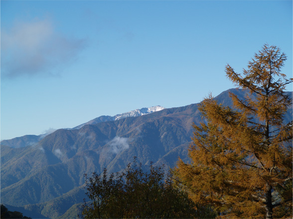 午前7時ちょうど、標高1,770mの夜叉神峠に到着した。胸のすくような秋晴れの下、薄く雪化粧した白峰三山と向かい合ったら、足の重さなどたちまち吹き飛んだ。
