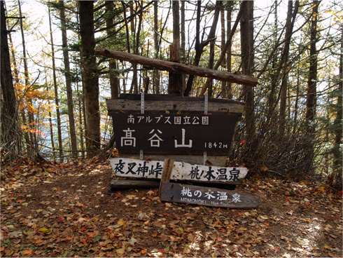 | 高谷山の頂。右手に進むと秘湯の桃ノ木温泉だ。 |