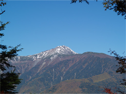 | 樹木の間に間ノ岳と北岳が見えた。写真は北岳。 |