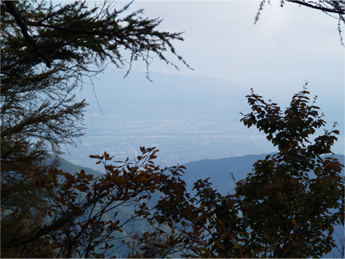 | 午前9時少し前、夜叉神峠登山道入り口を目指し、高谷山からの下山を開始した。間もなく右手に甲府盆地が見えた。写真の横方向に伸びる筋は、盆地を南北に流れる釜無川(かまなしがわ)だ。 |