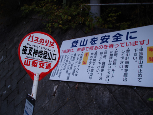 | 登山道入り口のすぐ近くに、甲府方面行きバスの停留所がある。後ろの看板「家族は、無事で帰るのを待っています」、その通りだよね。 |