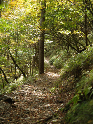 | 後半、山道は広葉樹に覆われるようになった。紅葉が始まった木も。気(木)が早いね。なんちて。 |