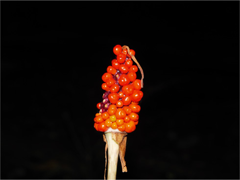 | 真っ赤に色づいたマムシグサ。茎にマムシに似た模様があるので、この名前になったとか。有毒らしい。 |